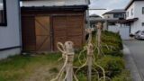 刈払機のナイロン刃について説明します。オンコに立てかけてありますが、先端の丸い皿のような回転部分からナマズの髭のようなナイロン紐が出ています。地図でいえば発電所の記号の様に見えます。そいつが回転の遠心力でまっすぐ伸び……