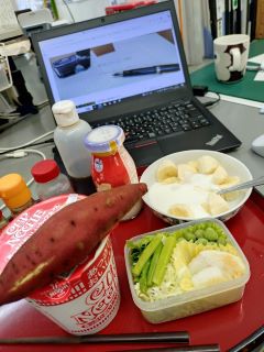 いつもは通販で購入している雑炊がメーンの社食。この日は私のリクエストでカップヌードル。お弁当袋を開けてびっくり。1本のサツマイモ。食欲の秋でもあるので、あれば食うし。体重の増加が気になります。