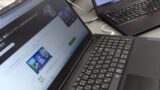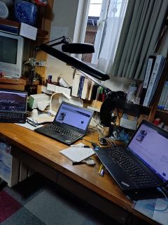 中央はLenovoのThinkpad。小型・軽量なので休日には家に持ち帰って「ひとこと」の入力に使うメーンPC。旅先にも持ち歩くので欠かせない。左右に控えるのは世代が古い。