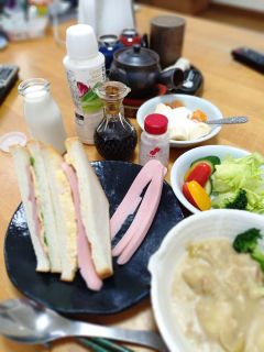 女房が高校同期との会食で留守の、いつぞやの土曜のボッチ飯です。スーパーのサンドイッチは私のリクエスト。それに前夜のクリームシチュー。私の頭を駆け巡っていたのは、1本の魚肉ソーセージを加熱処理しないで1本丸ごと食い尽くすこと。実にいじましい。高校時代の思いは引きずってはいません。ただの遊び心の大人食いです。