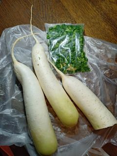 ダイコンは新鮮そのものでプリプリ。緑の葉っぱ付きなのが好ましい。女房は真っ先に「葉っぱが嬉しい!!」。昨年も頂きましたが、今年はかなり小ぶり。昨年の断面が南部煎餅並みだとすれば、それもはみ出た部分を含んだ太さもあった。今年は歌舞伎揚のサイズ……