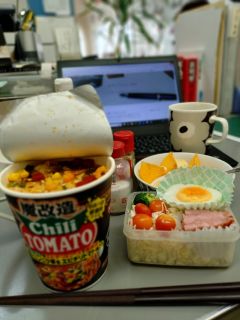 食べたかった“魔改造Chili TOMATO”と命名されたカップヌードル。いつもの雑炊食だと腹持ちが悪いとの女房の心遣いです。スープは濃厚で美味しかった。