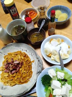 翌日のランチは冷凍のボロネーゼ。サラダが何やらシーザーサラダ風。サニーレタス、ブロッコリー、ミニトマト。それに謎の白い物体。チーズの欠片でもない。豆腐でした。和風ということで、醤油ベースに白ごま、ごま油、酢のお手製ドレッシングで頂きました。