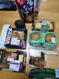 3日目の買い物。女房にはカツ丼、私はすきやき弁当。キュウリ、アボガド。前日にトマト、その前はキャベツを買ったので野菜は十分。朝の果物にラフランス、夕食後のモンブラン。箸休めに総菜です。