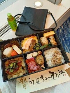 迎えたのは“銀座 旬菜青山のそら弁”。ツアーコンダクターの社長さんのきめ細かなサービスに脱帽です。1時間以上のフライトなので暇潰しに機内で食べようと意思統一したのですが、出発便の到着遅れで空港での暇潰しとなりました。