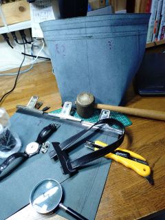 今回使っているヌメ革は40×40cm。1枚の革をチョイと厚めの底革に縫い付けたところです。手前は、もう一方の革です。姿が徐々に見え始め、嬉しくて写真に収めました。もう1枚を縫い付けると、その3枚の取り合い部分で如何に矛盾なく縫い上げるか、の関門が控えます。