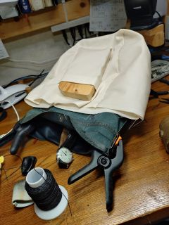 3月5日の21時48分です。昨日アップした画像からの進捗は、3枚革が合体して裏っ返しの袋状になり、これから内袋をどのタイミングで縫い付けるべきか…… 丈は大丈夫か、とか思案を巡らせているところです。