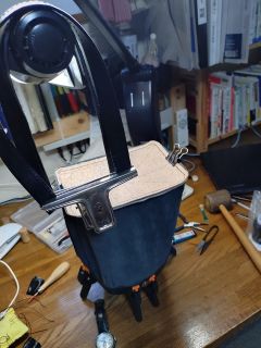 さて持ち手。様々な仕様があるようですが、2枚の革をそれぞれ輪っかに縫って、縫い目を見えないように4枚重ねにするのが丁寧で、主流のようです。今回の様に1枚革を2つに折ってステッチを入れるのでは、強度が不足のようでもあり、薄さが心許ないです。