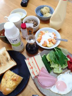 20日春分の日のランチです。11日付け「止めますか止めませんか」で食べ残した「オニオンチーズマヨ」が再登場です。冷凍してたので大丈夫、食パン2枚だと少々足りなそうだから女房と半分こでした。