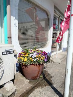 スリットの入った洗い桶からチョロチョロと静かに回しかけます。時計回りで花に負荷を与えないように、です。でもね、バケツの水をザバーッと一気に浴びせる会社外の無神経なヤツが、時に出現するのです。花は可哀そうに倒れて起き上がれません。残念なことです。この花鉢は私達に任せろ!! です。