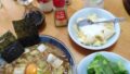 書斎には無くてリビングに二つあるのです。ごはんを食べる座卓、それに「朝のパン食にいいね」とそろえた4脚の椅子がセットのテーブル。コイツはほぼ女房の洋裁台に変わりました。テーブル端にはメジャーが貼り付けられている程で、ほぼミシンが置いてある。