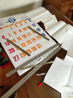 現在作業中です。カレンダーの裏に型紙を起こす、と先日書きましたが、今回は表を使いました。とっかかりがない白い紙に直角を正確に出すのが難しいからです。どうしても誤差が出ます。今回は日毎の桝の“直角”を活用です。