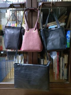 袋物の勢揃いです。下段の「パソコンだけ入れ用サコッシュ」の第1号は、言ってみれば欠点だらけの習作でしたが友人の女性の元へ旅立ちました。習作が故の及ばぬ点が多々ありましたが、「大切に使う」と有難いお言葉を頂きました。