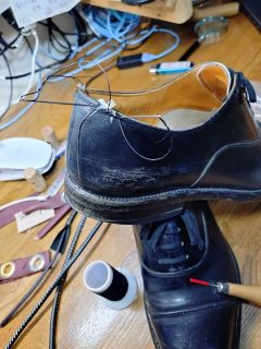 もう一つの細身のマレリーはどうにも窮屈になってローテーションが回らない。先日、苦渋の決断で新顔を購入したのでした。で、安心材料が出来たのでやおら修理をしてみようか、と。丸目錐で3カ所に穴を開け、強靭な糸で締め上げる……