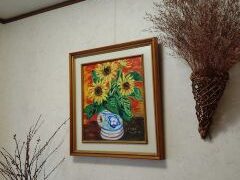 令和7年12月18日(木)。10時20分3.3℃。降水量0.5mm/h。風向・北西。風速1.4m/s。日照時間0分。曇り。積雪深0cm。玄関では伯母の5号の大作・「ヒマワリ(=仮題)」がお迎えします。花瓶に挿した4輪のヒマワリ。一部のヒマワ...
